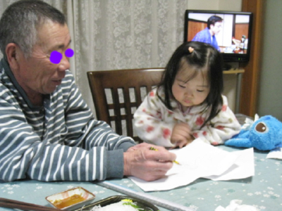 おじいちゃん、心羽にスティッチを描いてといわれて