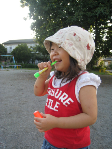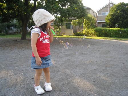 飛んでゆくシャボン玉を追いかけて遊ぶ姿がなんとも微笑ましい。
