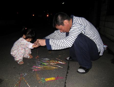 じゃぁ 小さい閃光花火をこうやってパパと一緒になら怖くないでしょう?