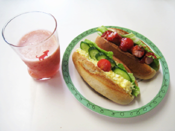 フランスパンは野菜や卵、ウインナーを挟んで頂きました。