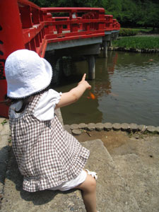 いつもの赤い橋、池にはたくさんの鯉や亀さんも泳いでいますね。
