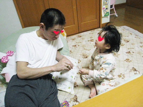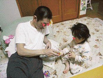 心羽の手からひらがなカードを1つもらったパパ。