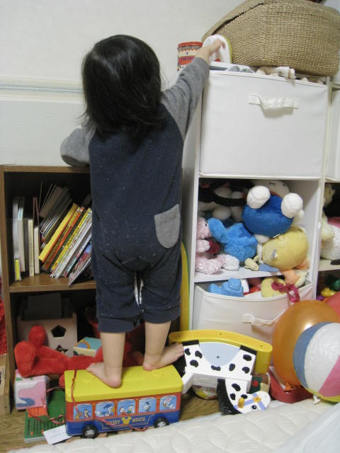 おもちゃや本を入れる収納を作ってあげた上の棚は