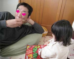 そんな休日の午後、小腹が空いたのかパパが「ウ・カール」を持ってポリポリ・・・