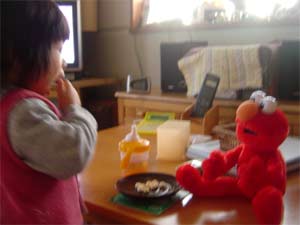 エルモと顔を見合わせて、「美味しいね♪」 って言ってるかの様。