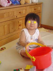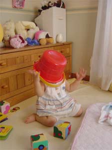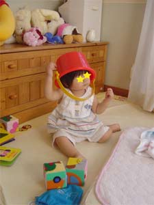 教えてもないのに、自分でバケツをかぶって遊ぶようになって。