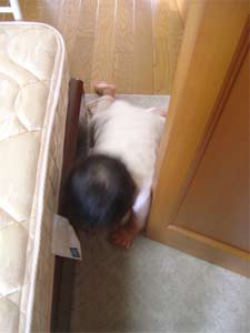 ベッドと折り戸の隙間を猫さんみたいに通りぬけてこようと必死