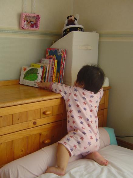 朝、目が覚めてまず向かうのはママ、ではなく本のある所。