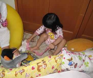 静かだと思ったらペンギンさんに巻いてあげてました。