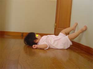 そそ、壁立ち、いや、寝て足を突っ張ってるのが可笑しいよね。