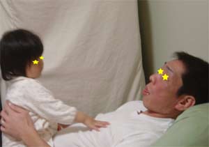 家に帰ってきてお風呂から上がってパパのお腹に乗って遊んでた心羽に